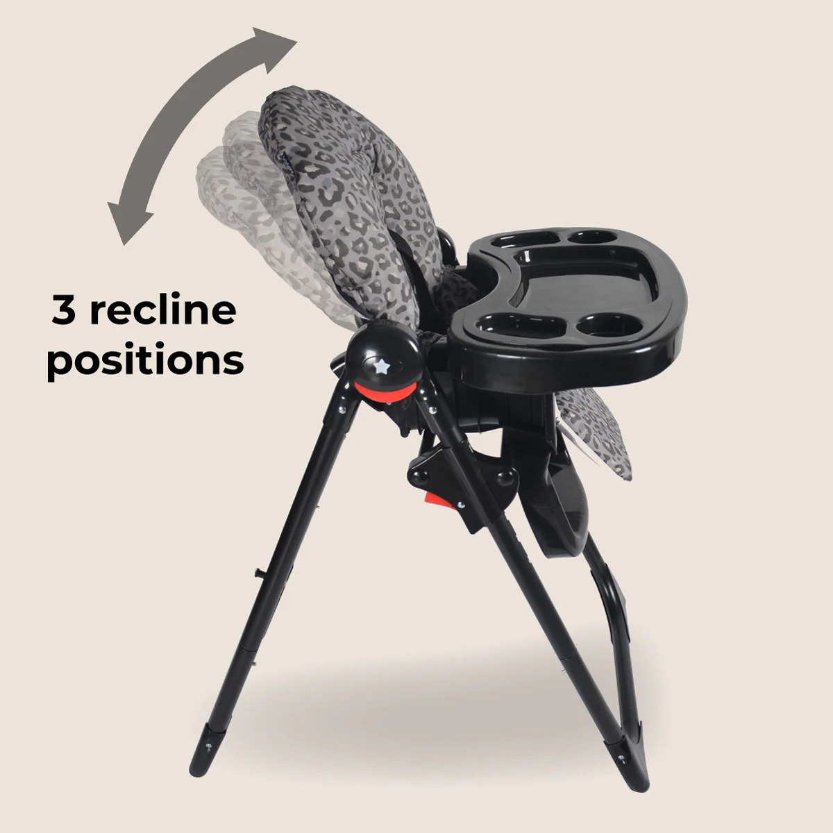 The highchair boasts a stylish black leopard design for an on-trend, refined look. The Highchair has a sleek black frame and is cleverly styled for little ones that love to dream big. This highchair is sleek & stowable. Its two-part removable tray conveniently detaches when done and clips on the back of the highchair for a slim silhouette. With an easy-fold design, it stands on its own when folded and can be stored out of the way when not in use. But with an eye-catching and stylish design like this, you can be just as happy leaving it up in the kitchen all of the time!