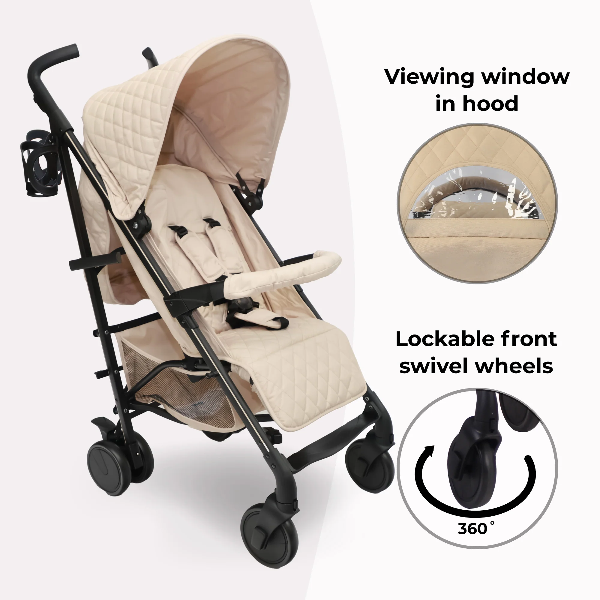 This stylish quilted sand stroller combines the style and function you expect from a super talented mum. Tough enough to take everywhere with you and use everyday, the lightweight aluminium umbrella fold stroller is packed with features to make using it as comfortable for you and your little one as possible. Suitable from birth, the seat reclines right back and has an adjustable leg support so your little can sit, or lay back in total comfort, shade from the sun and elements by an extendable 3 position UPF canopy. Suspension all round and single front wheels means the ride is super smooth, and adjustable handles mean you can push in comfort too. The basket is large and there is a handy pocket at the back of the hood for your phone (or snacks!), and a viewing window so you can maintain a visual on your precious cargo. This lightweight stroller comes with a free cosy footmuff, cup holder and rain cover so that if you are strolling and it starts to rain, we have you covered!